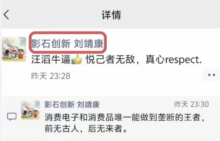 就在久谦咨询发布那份报告当天,刘靖康怒发一条朋友圈:“汪滔牛逼,悦己者无敌,真心respect。”又在回复中称大疆是“消费电子唯一能做到垄断的王者”。