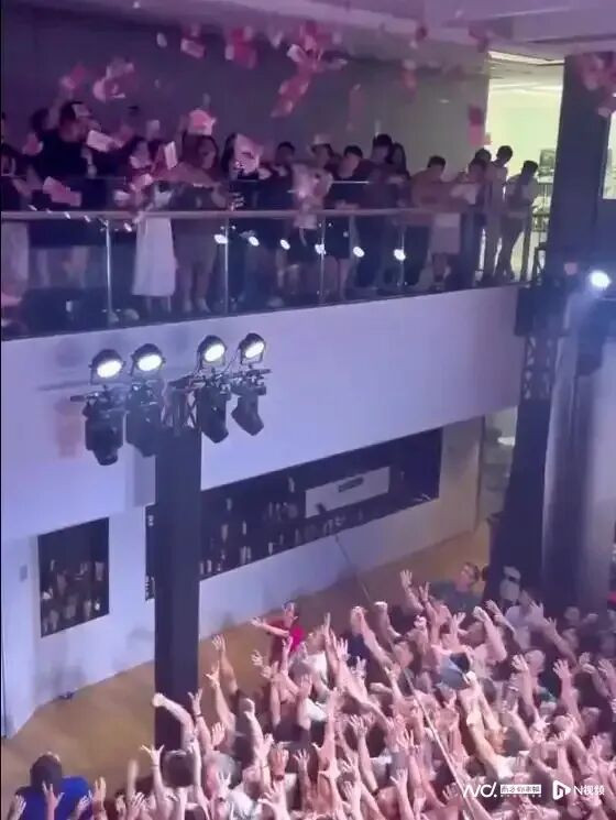 活动现场, 刘靖康手持百元大钞站在阁楼上,向楼下员工撒钱,员工伸手接的接捡的捡,场面一度陷入疯狂。据称,刘老板当晚整整撒了20 万。